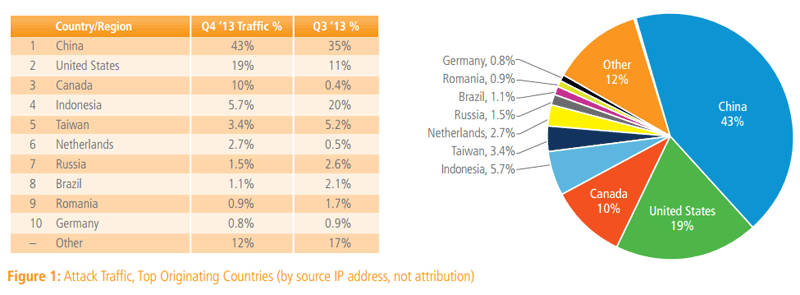 Akamai ve zprávě hodnotila také podíl výskytu internetových útoků. Asi nikoho moc nepřekvapí, že nejvíce útoků přichází z Číny, celých 43 procent (mimochodem je to o 8 procent více než loni). Druhý největší zdroj útoků je v USA, odkud do světa míří 19 procent útoků. Spojené státy si v tomto meziročně polepšili o 8 procent. Třetí největší zdroj útoků je překvapivě s 10 procenty Kanada. Překvapení je to velké, když uvážíme, že o rok dříve z Kanady přicházelo pouhých 0,4 procenta.